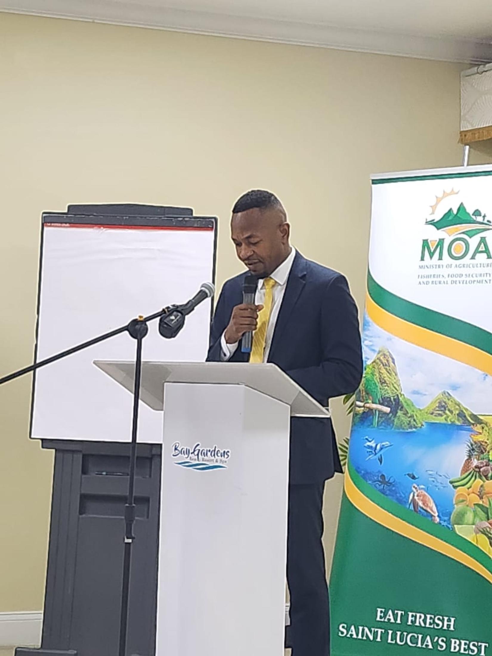 Caption: Mr. Bradley St. Ange, Permanent Secretary, Ministry of Agriculture, Fisheries, Food Security and Rural development in Saint Lucia delivering the Opening Address to the dialogue.